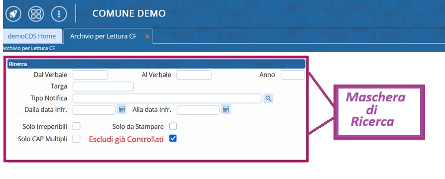 Possiamo filtrare un elenco attraverso la Maschera di Ricerca in alto a sinistra (Ad esempio, possiamo filtrare per un numero di targa, per un tipo di notifica, per un periodo di Date Infrazioni o da un numero progressivo di verbale ad un altro e/o per un anno progressivo… ma è anche possibile combinarli per avere una selezione ancora più specifica!).