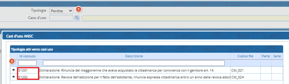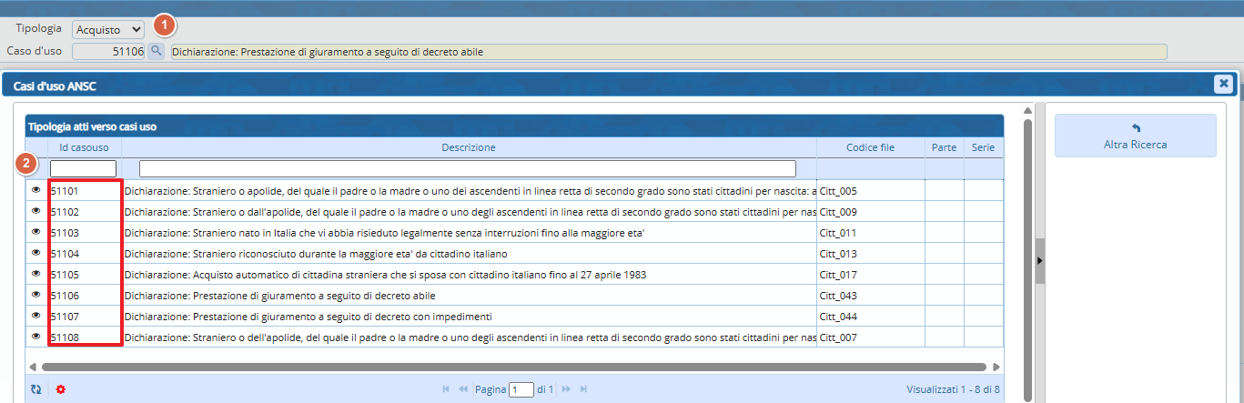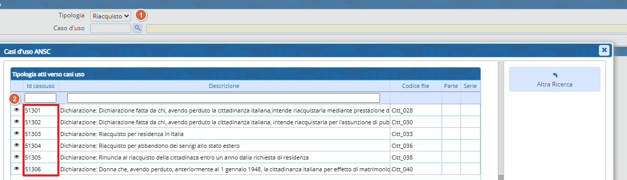La scelta del caso d'uso ANSC per gli atti di cittadinanza viene proposta su Cityware Online già divisa a seconda della tipologia di operazione che dovrete eseguire, in modo da limitare l'elenco dei casi d'uso che vi sono proposti e aiutarvi nella redazione.