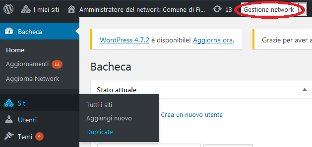 È possibile creare un nuovo sotto-sito dalla voce di Menu, nella Gestione Network, “Siti » Duplicate”
