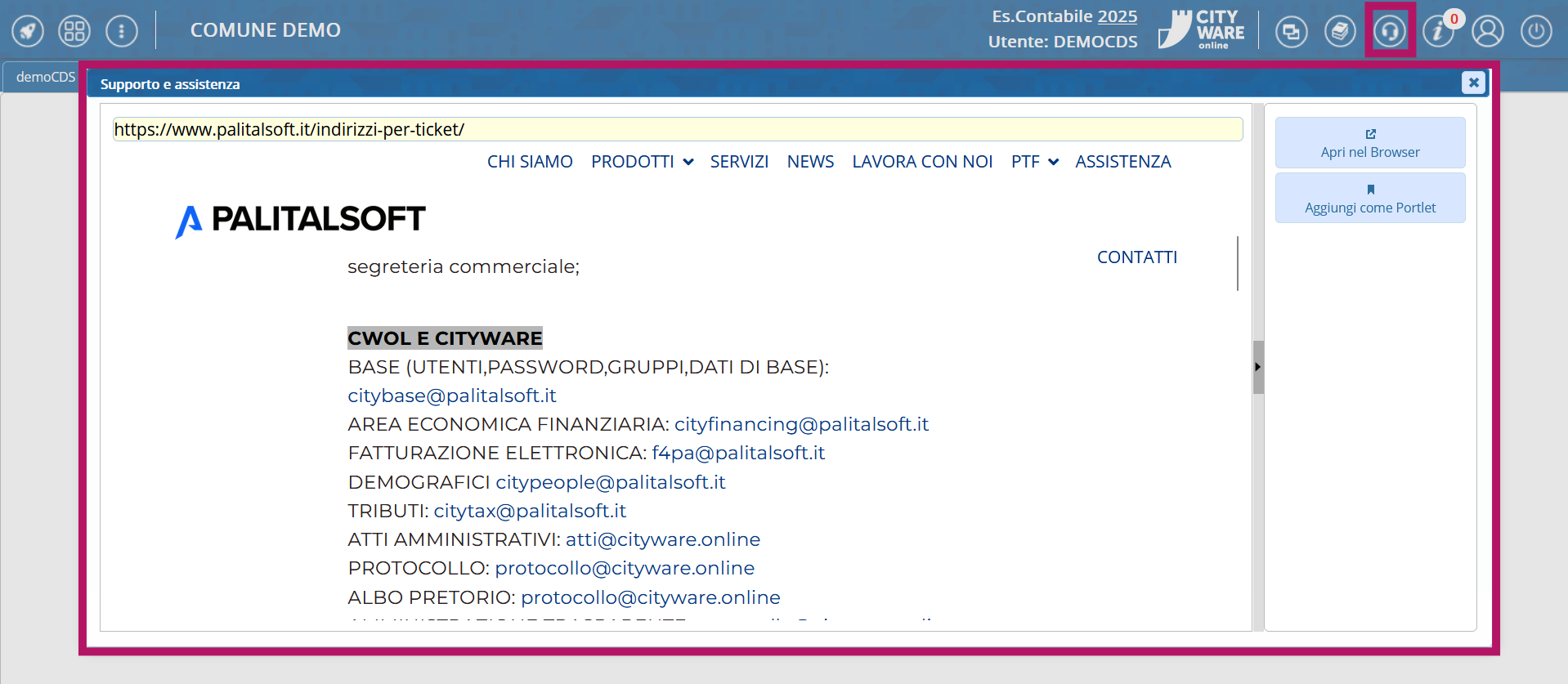 Con il bottone [Apri nel Browser] si apre il sito ufficiale di Palitalsoft (https://www.palitalsoft.it/indirizzi-per-ticket/)
