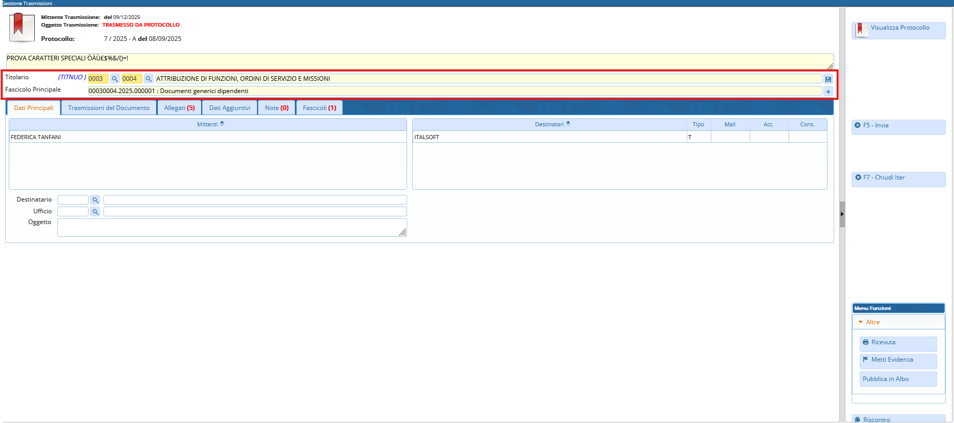 Dopo aver preso in carico il protocollo, si attiverà la possibilità di sistemare il titolario, se sbagliato o incompleto, e inserire il protocollo nel fascicolo corretto.