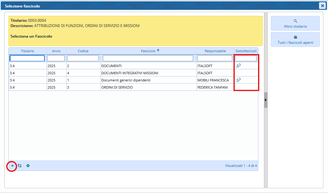Si può scegliere il fascicolo con un doppio click oppure selezionare un sotto-fascicolo o ancora, per i soli utenti con permesso Completa o Archivistica, creare un fascicolo nuovo dal +.
