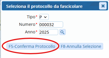 Cercare e aprire il fascicolo in cui si vogliono inserire uno o più protocolli.
