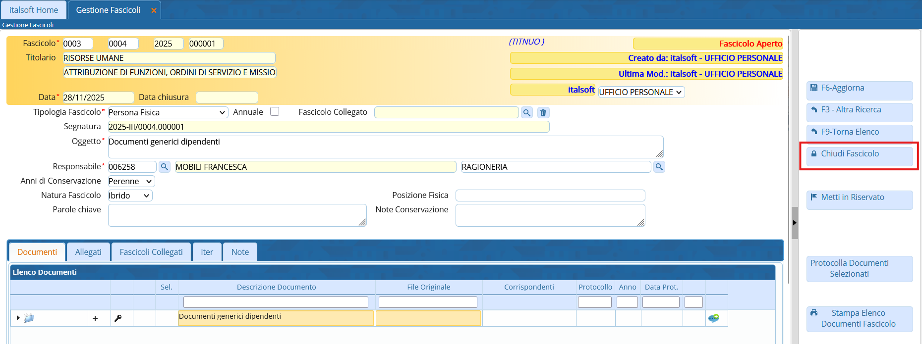 Per chiudere un fascicolo, cliccare Chiudi Fascicolo.