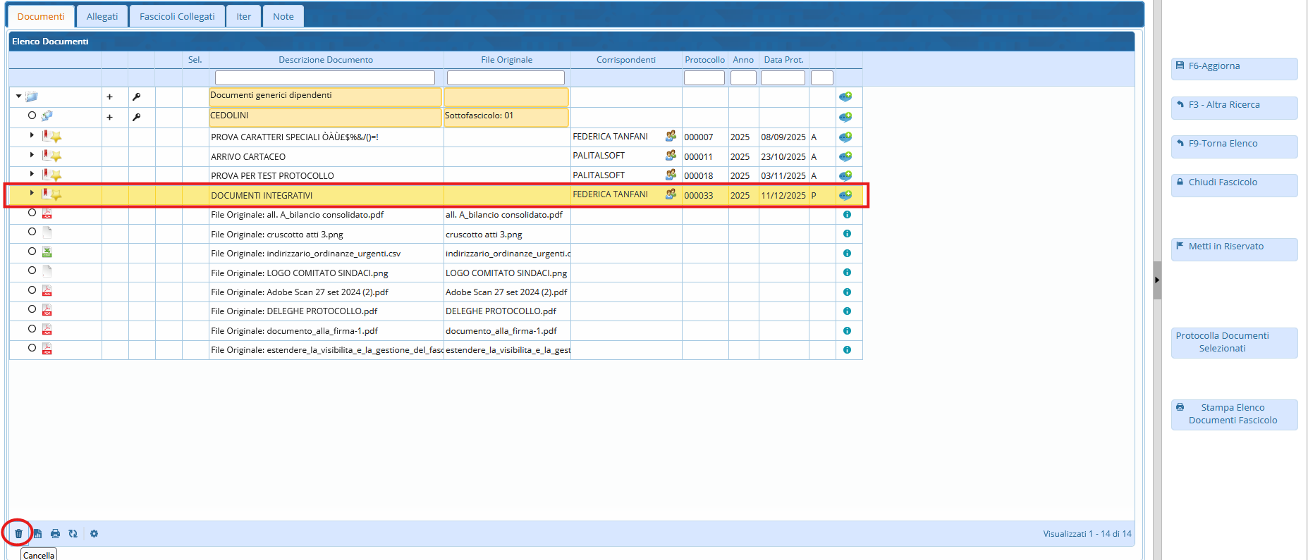 Selezionare con un click il protocollo o il documento da togliere. La riga deve diventare gialla.