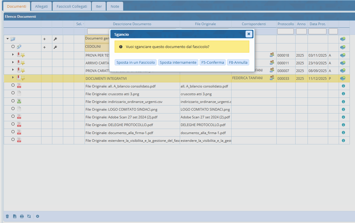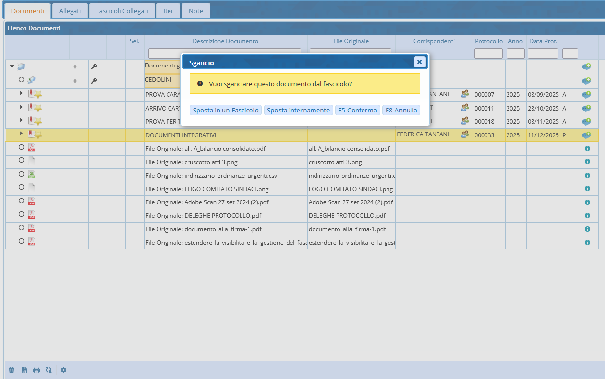 Se il protocollo/documento deve essere spostato in un altro fascicolo, scegliere Sposta in un Fascicolo.