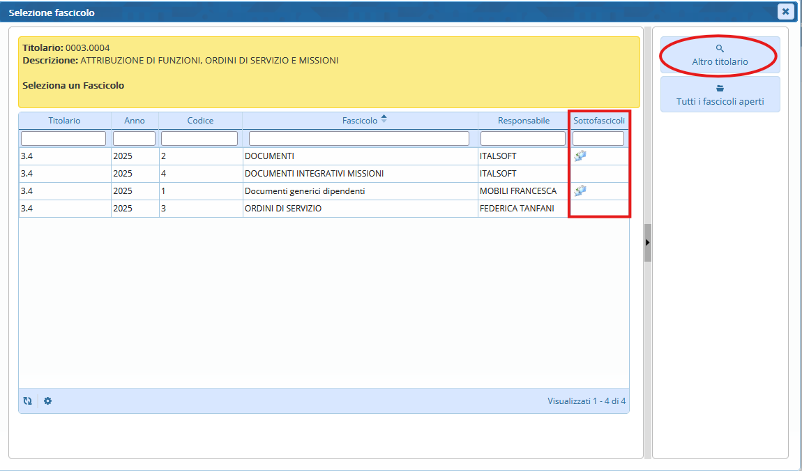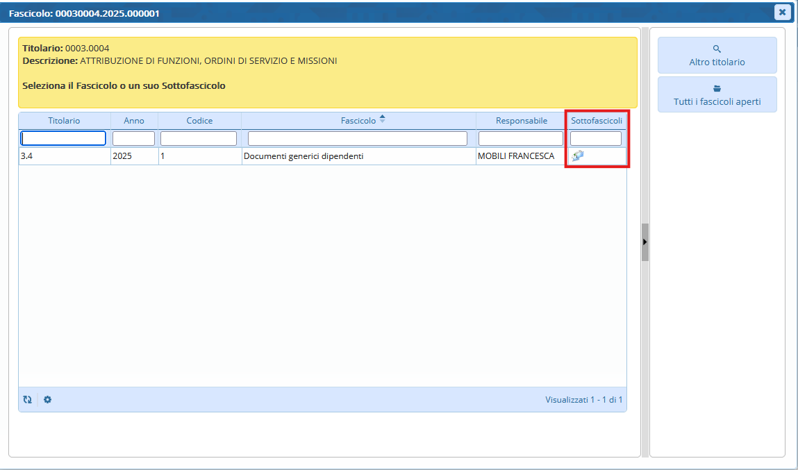 Dall’elenco è possibile scegliere un altro fascicolo/sotto-fascicolo della stessa classificazione oppure selezionare Altro Titolario per selezionare un fascicolo con una classificazione diversa.