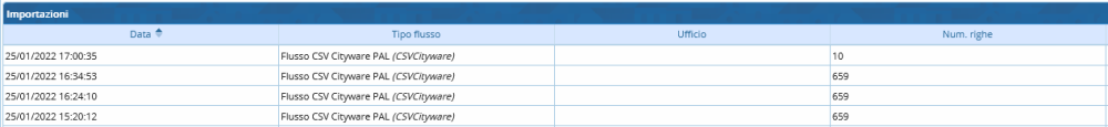 Terminato il caricamento, nella tabella “Importazioni” verrà visualizzata una riga con la data del caricamento, la tipologia, l'ufficio ed il numero di righe caricate.