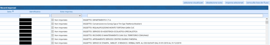 Con i bottoni in alto a destra è possibile Selezionare / Deselezionare tutte le righe visualizzate, Importare le righe selezionate, tornare alla lista dei flussi