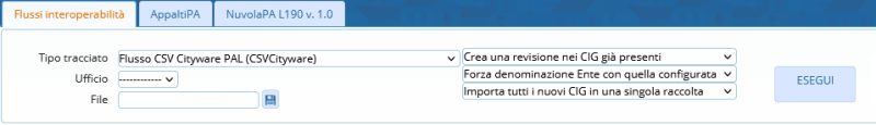 Per caricare un flusso è necessario selezionare la tipologia dei dati da importare. Attraverso questa scheda si possono importare vari flussi dati, tra cui quelli del portale trasparenza ANAC e i flussi STANDARD XML generato da qualsiasi software, purché creato e validato secondo le regole L.190/2012. In base alla selezione potrebbero essere disponibili ulteriori opzioni da selezionare.