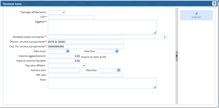 Per inserire un nuovo affidamento, premere nel simbolo “+” posto in basso sinistra . Per semplificare l’inserimento, verrà impostato in automatico come oggetto del lotto, il titolo del contratto inserito in precedenza.