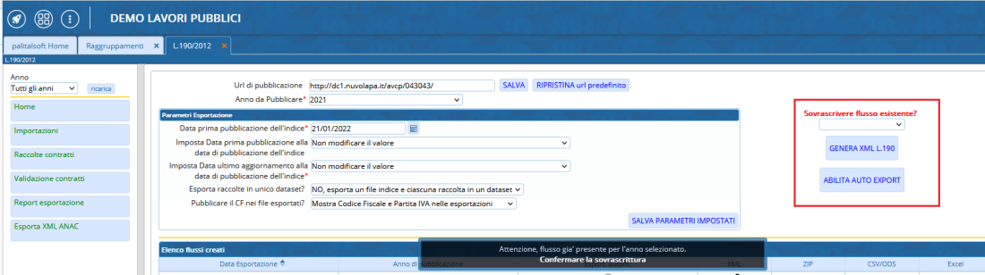 E' importante ricordare che la procedura di generazione del flusso XML da pubblicare, seleziona ed esporta i contratti sulla base dell'anno di riferimento. Nel caso in cui si effettui un aggiornamento dei dati, dovrà essere modificato necessariamente l'anno di riferimento.