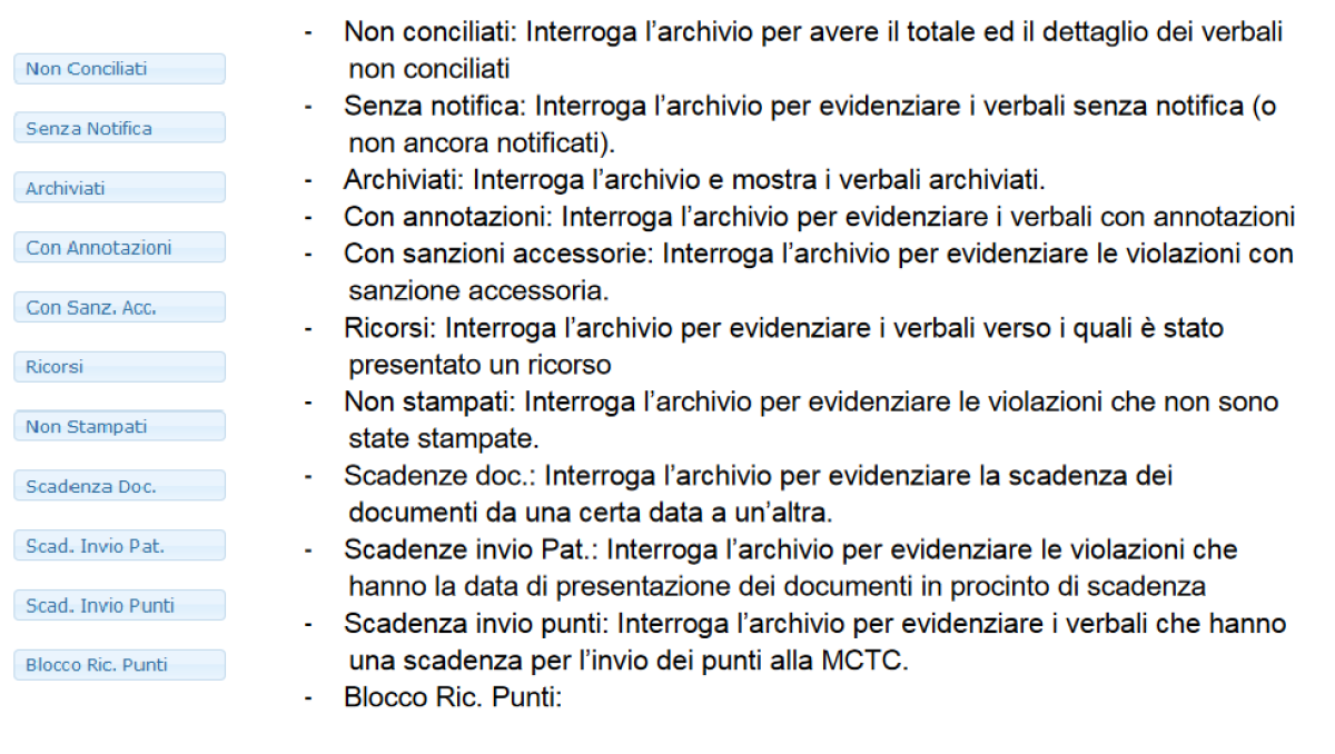 Ogni bottone effettua una specifica ricerca all’interno della base di dati. I bottoni elencati sono le ricerche più comuni che solitamente si effettuano.