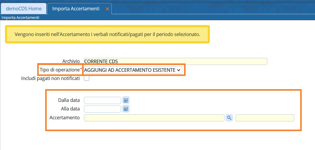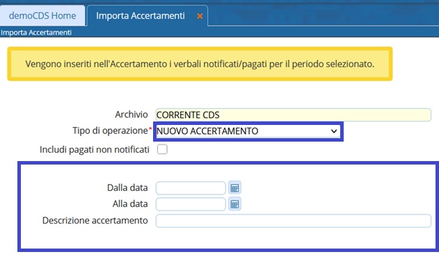 Dai tre puntini e andando nella sottosezione 'Carica Accertamento', potremmo inserire nell'Accertamento i verbali notificati/pagati per il periodo selezionato.