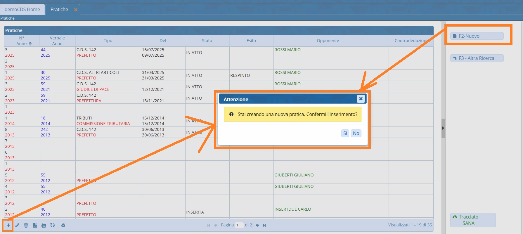 Per creare una nuova pratica, basterà fare click sul bottone + in fondo alla tabella o su [Nuovo] presente a destra dello schermo. In entrambi i casi vi verrà chiesto se volete confermare inserimento di una nuova pratica (SI per confermare, NO per annullare). Facendo SI verrà già creata una nuova pratica che andremmo a dettagliare in seguito.