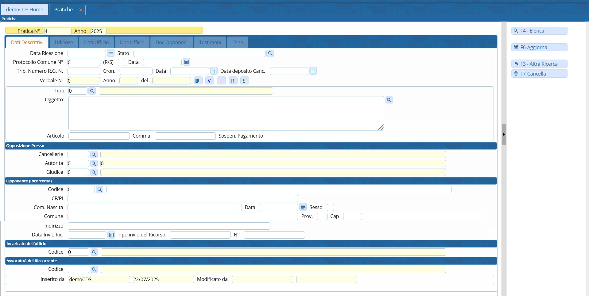 Ci troveremo di default nel tab 'Dati Descrittivi' (dove andremmo ad inserire i dati principali), ma potremmo spostarci anche negli altri tab cliccando sulla sezione interessata; in 'Udienze' andremmo a definire tutti i dati relativi alle udienze; in 'Dati ufficio' potremmo andare a definire le controdeduzioni; in 'Doc. Opponen.' andremmo a gestire i Documenti degli Opponenti; in 'Testimoni' andremmo ad inserire i dati di eventuali Testimoni, In 'Esito' definiremo l'esito della pratica. Abbiamo anche il tab 'Documenti Ufficio' che vedremmo poco più avanti in questa guida.