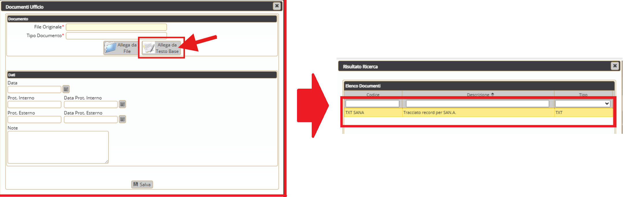 Interagendo prima sul + in basso a sinistra, poi cliccare sul bottone [Allega da Testo Base] e selezionare il testo base del tracciato sana