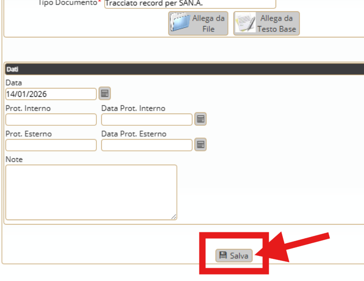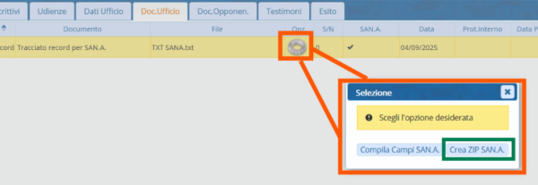 Sempre in “Doc. Ufficio”, potremmo proseguire con la creazione del tracciato record per SANA con il formato txt nel file zip in maniera MANUALE o MASSIVA