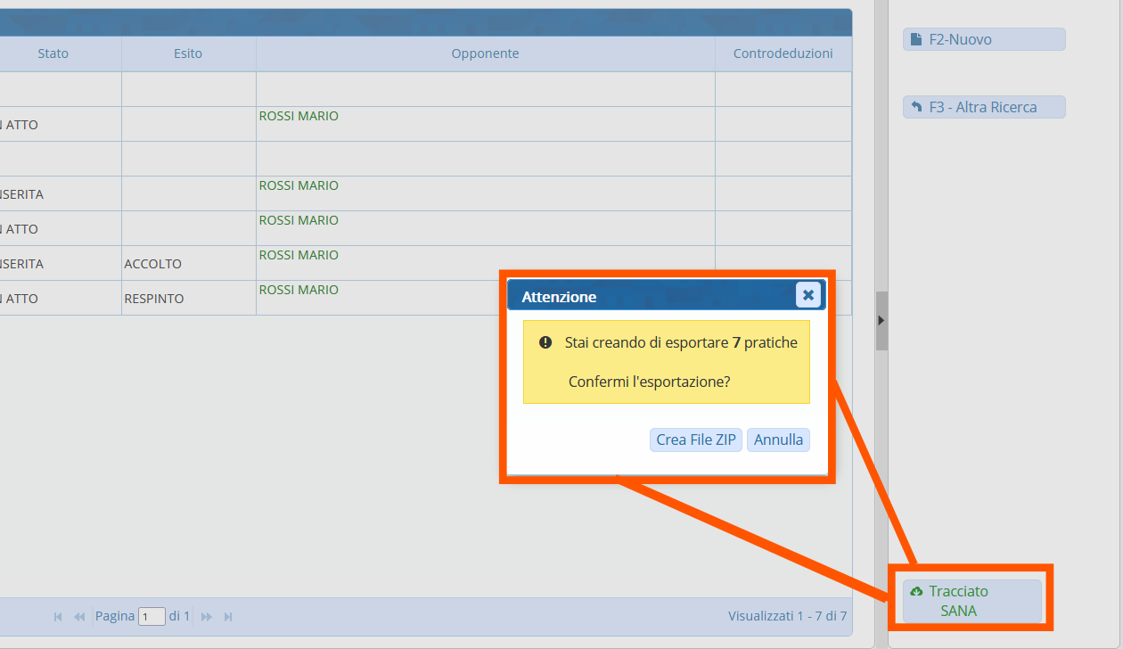 Una volta qui possiamo scremare il risultato con i filtri nella maschera di ricerca, prima di fare “Elenca”. Una volta che avremmo a schermo il risultato della ricerca, interagire con il comando [Tracciato Sana] in basso a destra. Per confermare l'applicazione fare click su [Crea File ZIP], altrimenti fare 'Annulla'