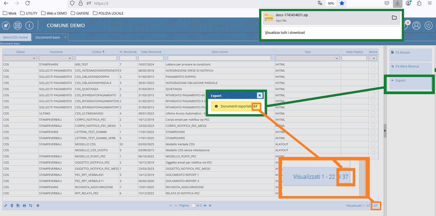 Con il Comando [→ Export] potremmo esportare tutti i documenti presenti in elenco in una cartella zip (se sono stati impostati filtri prima di entrare nell'elenco, verranno esportati i documenti che rispettano i filtri di ricerca).