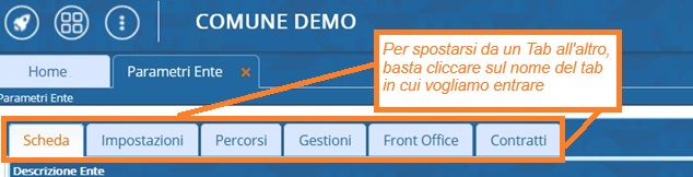 Andando nella sottovoce di 'Amministrazione CDS' chiamata 'Parametri Ente' ci ritroveremo di default nel tab 'Scheda'.