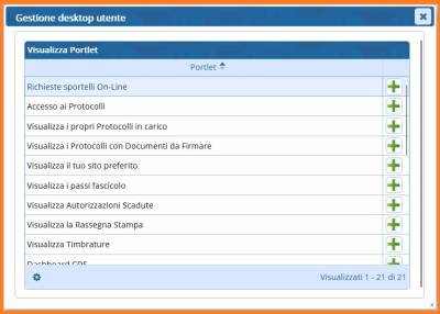 Il quadratino del [+] verde ci permette di aggiungere il portlet alla Home della nostra utenza. Al contrario, la [X] rossa ci permette di togliere un portlet che avevamo impostato nella Home.