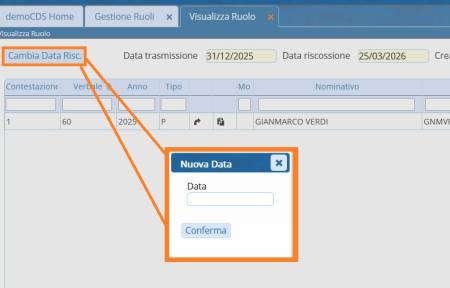 Per impostare un'altra data di riscossione, bisogna entrare all'interno del ruolo in questione, una volta dentro cliccare sul comando [Cambia Data Risc.] in alto a sinistra. Si aprirà a schermo un piccolo pannello dove potremmo scrivere la nuova data di riscossione del ruolo. Per confermare cliccare su 'conferma'.