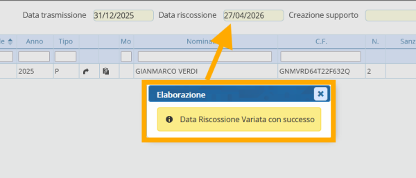 Comparirà una segnalazione gialla della conferma variazione Data Riscossione