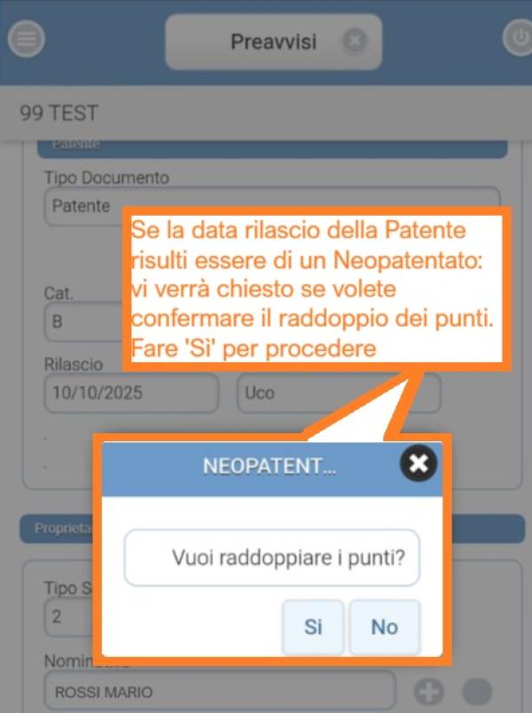 Nel caso in cui un Conducente sia un Neopatentato, vi verrà chiesto una conferma per procedere con il raddoppio dei punti. Fare [Sì] per procedere con il raddoppio o [No] per non applicarlo.