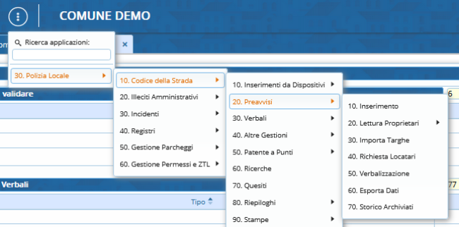 Dal Menù Principale e andando nella sezione Preavvisi del menu potrete gestire separatamente quei preavvisi emessi dagli operatori di P.M. non ancora verbalizzati dai verbali.