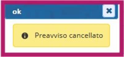 Scelta la motivazione con un doppio click sulla riga, apparirà un messaggio di conferma cancellazione del preavviso