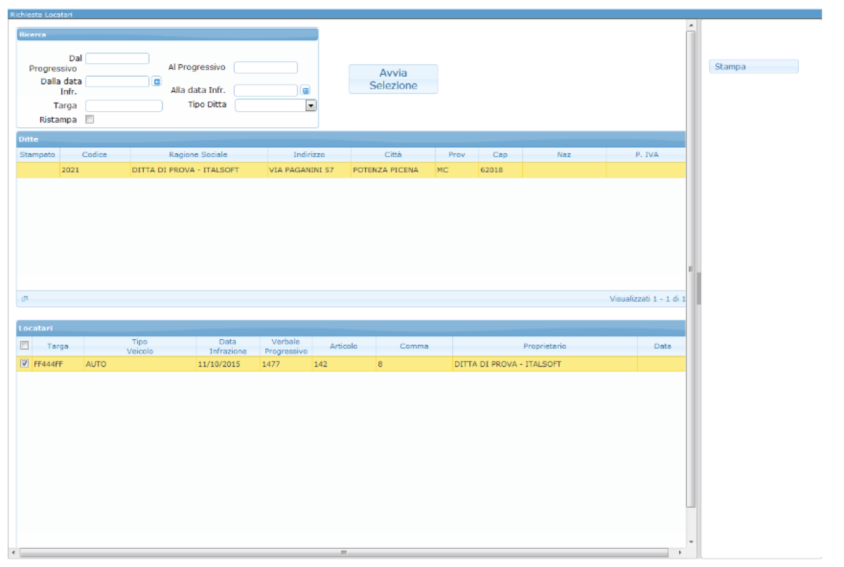 Dal menù Preavvisi, cliccando sulla voce Richiesta Locatari, si aprirà la pagina di filtro per avviare la ricerca del veicolo. Una volta compilati i campi nel riquadro di ricerca, basterà fare click sul bottone “Avvia Selezione”. Nel riquadro sottostante, nominato come Ditte, sarà presente la ditta che possiede il veicolo. Facendo poi click sull’azienda, comparirà nel riquadro sottostante, nominato Locatari, i locatari del veicolo (esempio in Figura sottostante). Basterà ora selezionarne uno o più, e fare click sul bottone Stampa presente sulla destra, per stampare la lettera di richiesta locatario da inviare alla società di Locazione.
