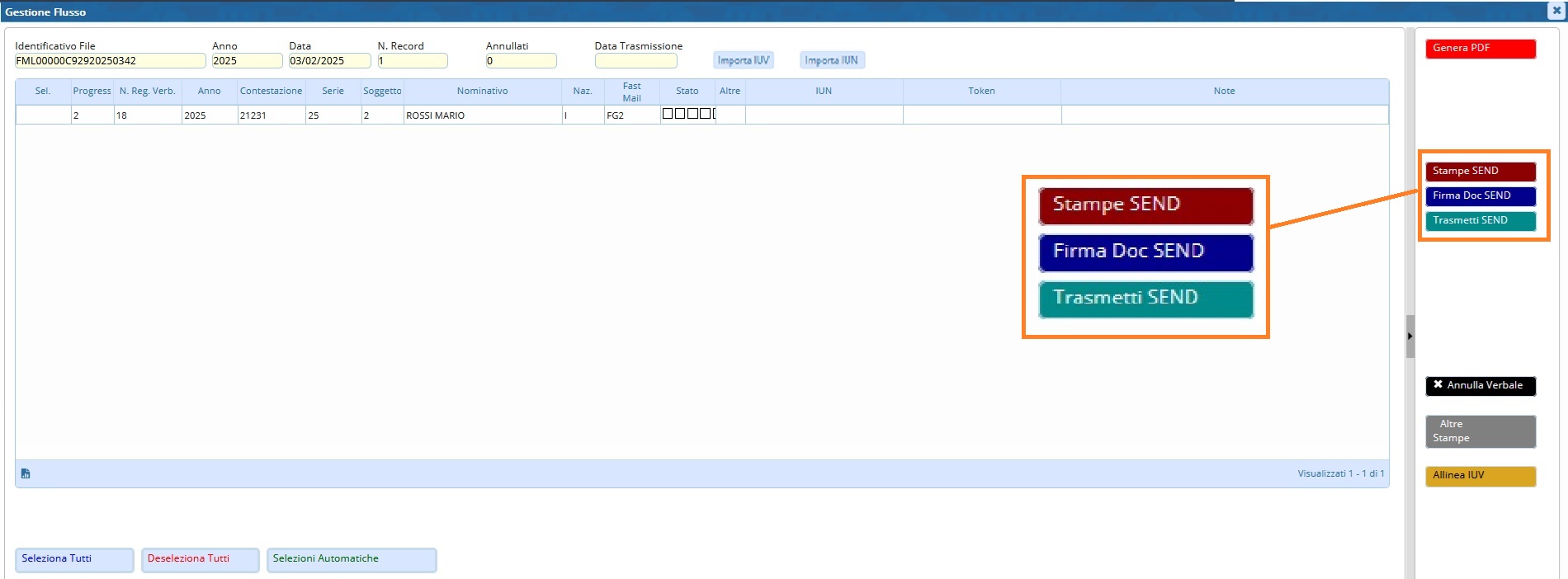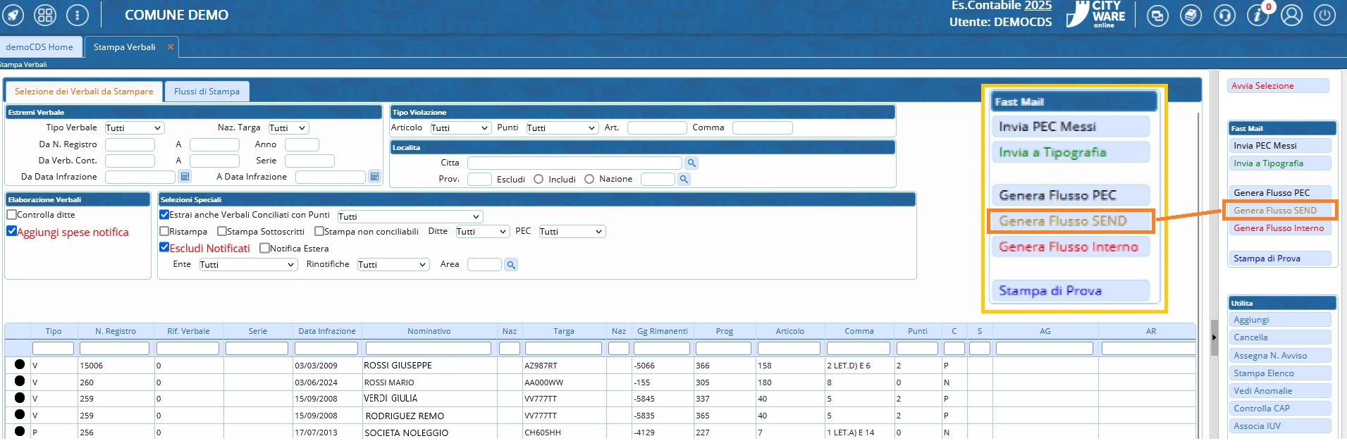 Dopo aver attivato SEND nella scheda “Stampe Verbali” comparirà il tasto “Genera Flusso SEND”. Il tasto in questione servirà per la generazione di flussi PND.