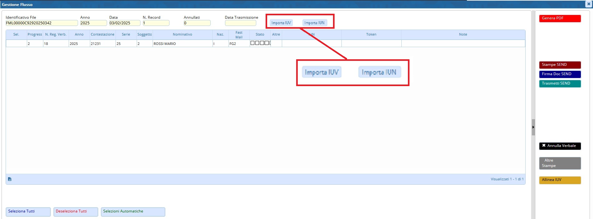 - Importa IUN: Funzione che richiama l’importazione degli IUN e li associa al verbale. Se la procedura è andata a buon fine e gli IUN sono disponibili la colonna “IUN” nella griglia sarà popolata.