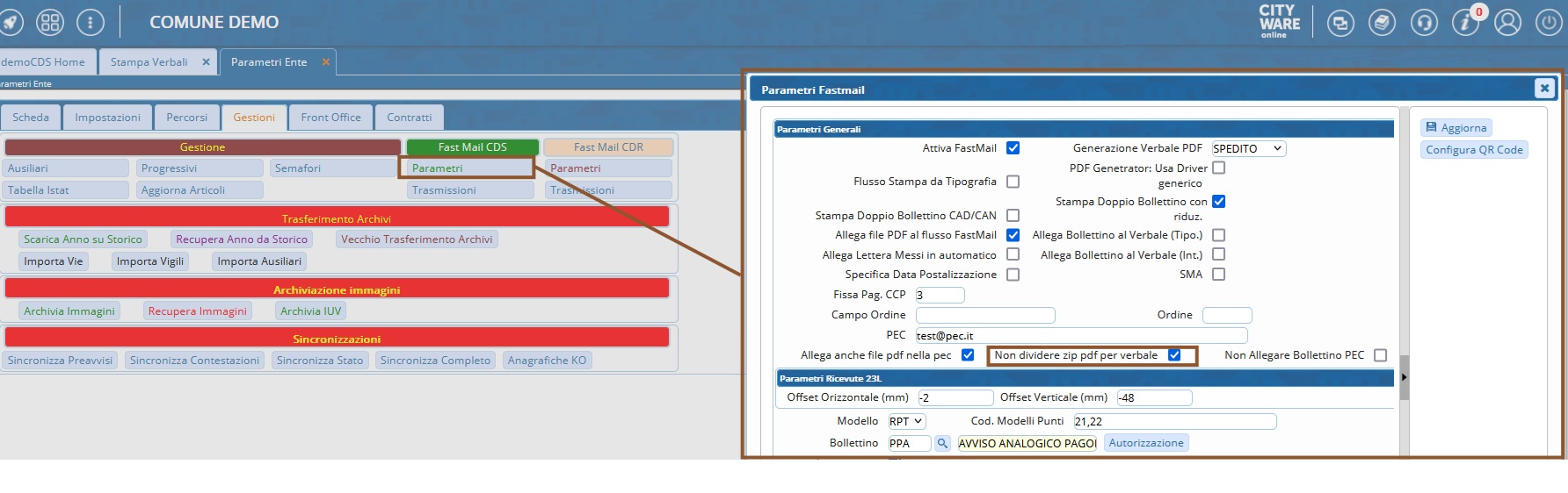 N.B. La generazione dei verbali segue le regole impostate su Parametri Ente -> Parametri FastMail. I Modelli bollettino dovranno essere selezionati in questa pagina (Selezionare “Bollettino PPA” per utilizzo SEND). È anche possibile dividere i pdf in cartelle separate con la spunta “Non dividere zip pdf per verbale” (il parametro è attivo con la presemza della spunta bianca su sfondo blu)