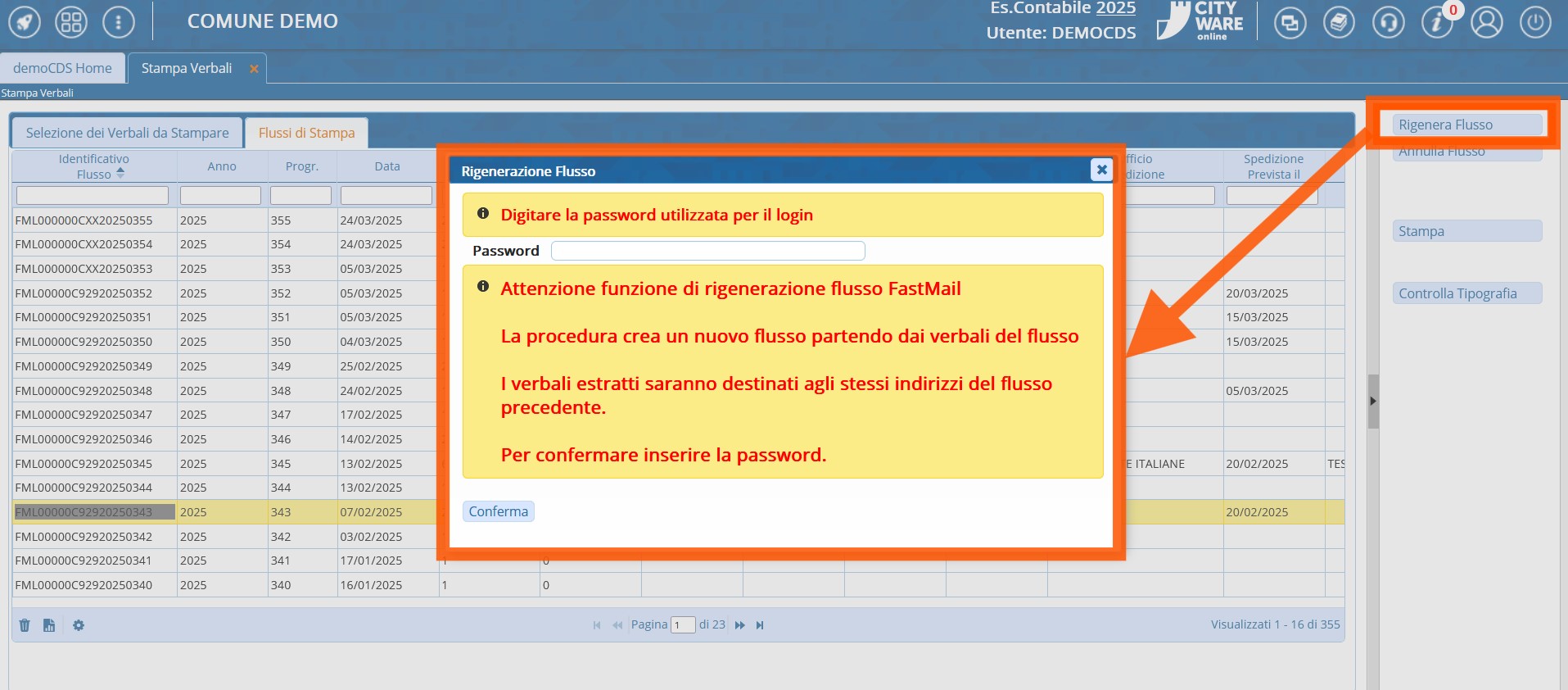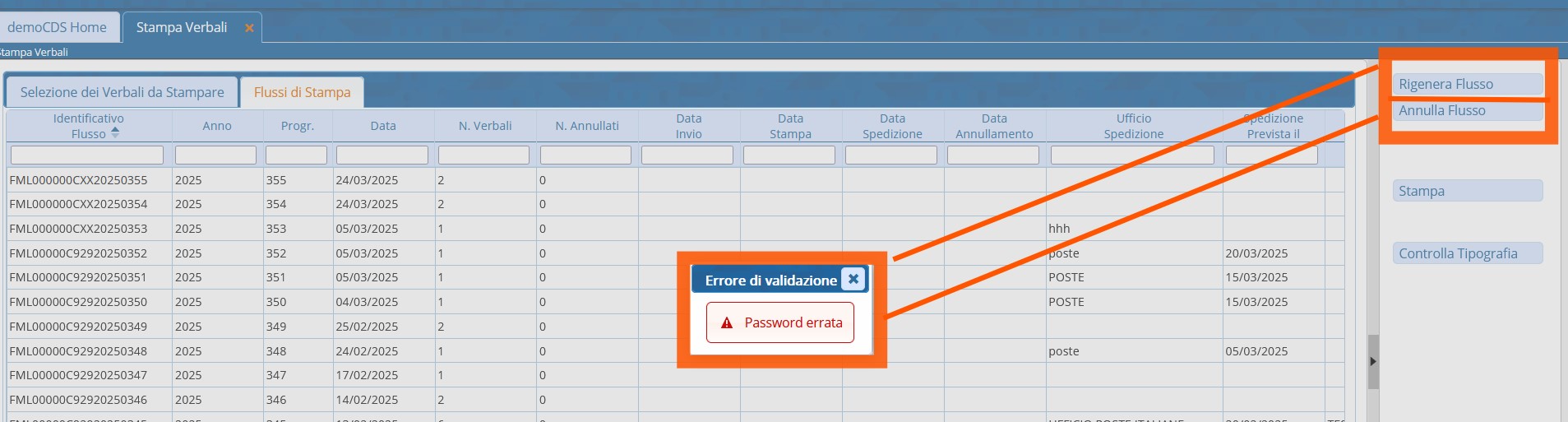 Per poter rimandare in stampa i verbali presenti in un flusso di stampa che è stato annullato, bisogna cliccare sulla riga del flusso per selezionarlo (la riga diventerà gialla!) e poi sul comando [Rigenera Flusso], presente a destra