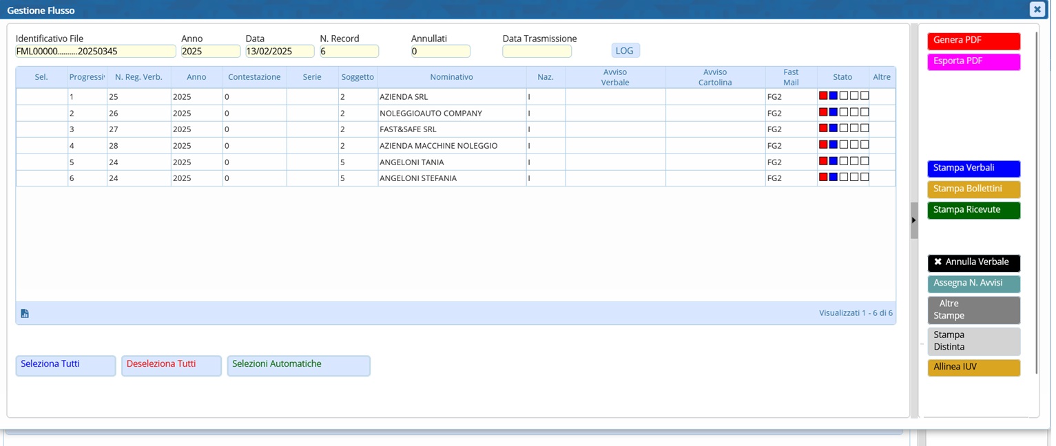 Sarà possibile consultare i Flussi di Stampa precedentemente creati, spostandosi sull’apposita scheda, posta di fianco alla scheda Selezione dei Verbali da Stampare. Per maggiori dettagli: