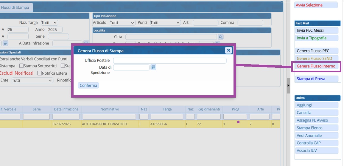 Dopo aver creato la selezione dei verbali Come fare la selezione? da mandare in stampa, per generare un flusso interno ( quindi stampato nella propria sede, interno al comando) fare click sul bottone Genera Flusso presente nel menù di destra. Comparirà un messaggio pop-up dove sarà possibile inserire ulteriori informazioni, e la prevista data di spedizione. Facendo poi click sul bottone Conferma, verrà creato il flusso di stampa.