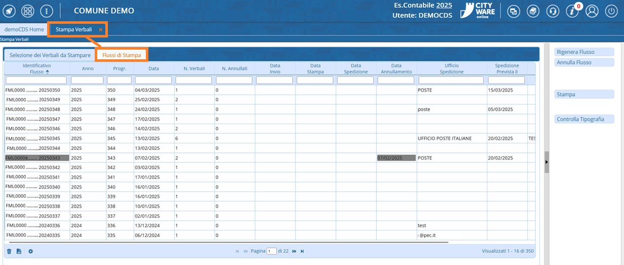 Dopo aver creato la selezione dei verbali Come fare la selezione? da mandare in stampa, per generare un flusso interno ( quindi stampato nella propria sede, interno al comando) fare click sul bottone Genera Flusso presente nel menù di destra. Comparirà un messaggio pop-up dove sarà possibile inserire ulteriori informazioni, e la prevista data di spedizione. Facendo poi click sul bottone Conferma, verrà creato il flusso di stampa.