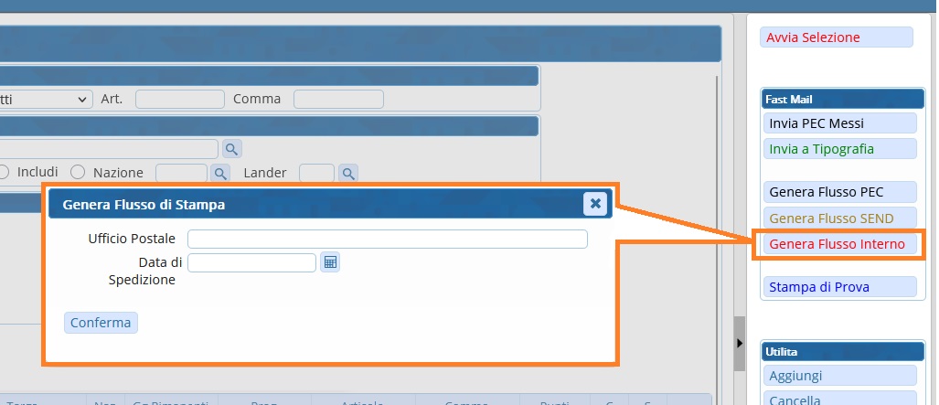 Comparirà un messaggio pop-up dove sarà possibile inserire ulteriori informazioni, e la prevista data di spedizione. Facendo poi click sul pulsante 'Conferma', verrà creato il flusso di stampa Interno (Con “stampato internamente” si intende nella propria sede, all'interno del proprio Comando/Organo).
