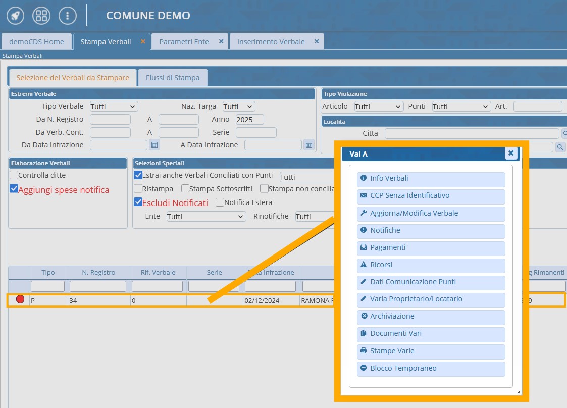 - Abbiamo una comoda scorciatoia per andare in una sezione specifica di un verbale uscito in selezione(ad esempio per vedere la sua Scheda generale per aggiungere un indirizzo di destinazione pec). Dopo eventuali modifiche, occorrerà salvare i dati inseriti con il comando “registra” e poi riavviare di nuovo la selezione dei verbali selezionati per la stampa per aggiornare le modifiche