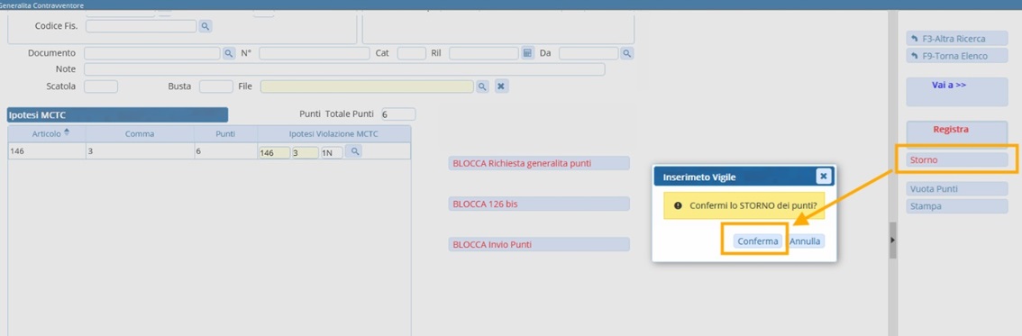 - SECONDO PASSO: Una volta confermato l'operazione per fare lo storno dei punti con [Conferma], il numero dei punti andrà in negativo (Es.: da 6 a -6)