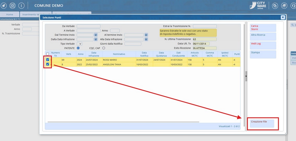 - QUINTO PASSO: Dopo aver selezionato i verbali (tramite i quadratini bianchi a sinistra sulla riga, per selezionarli tutti cliccare sul quadratino bianco su sfondo azzurro!) che ci interessa da mandare alla MCTC perlo storno, poi cliccare su [Creazione File] per creare il tracciato.