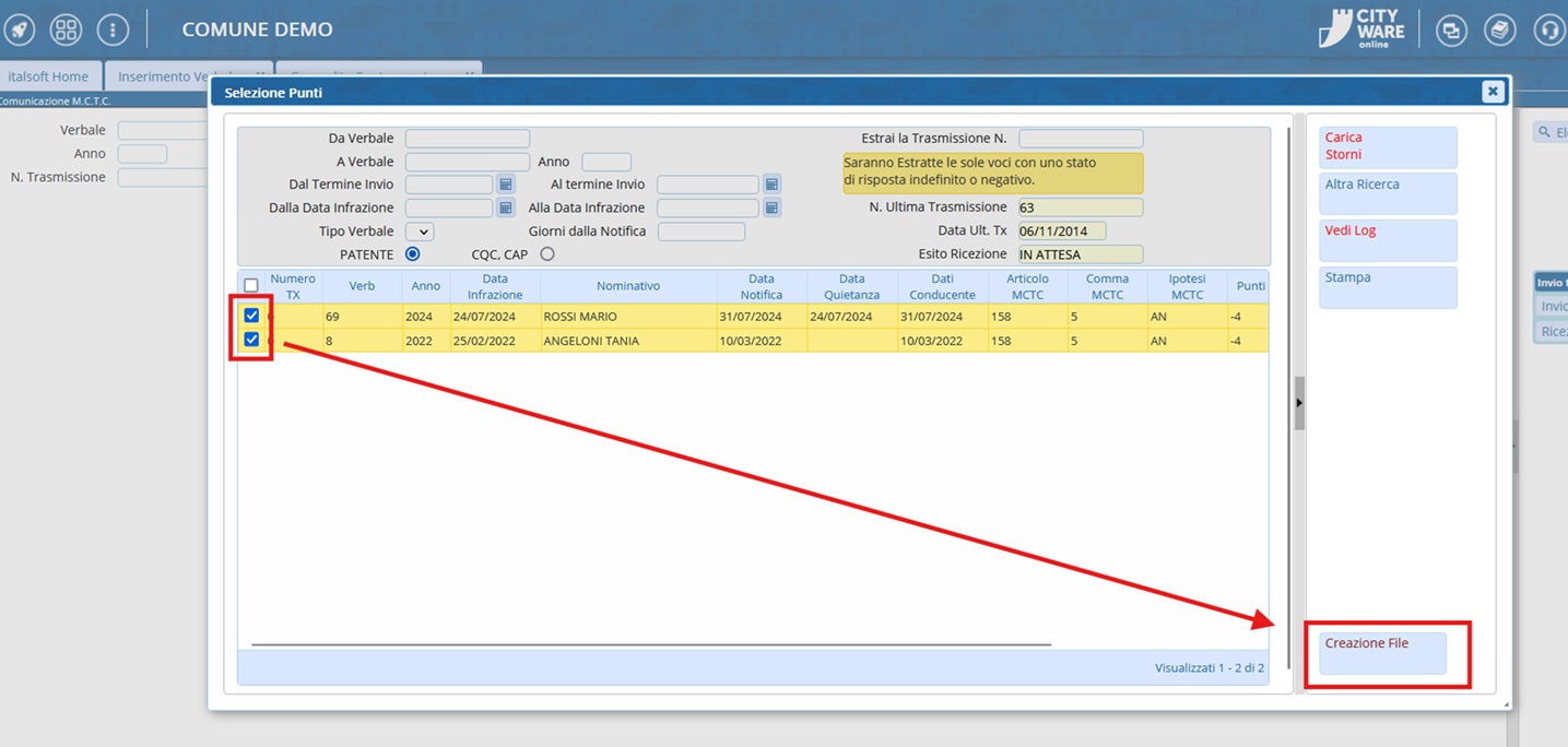 Poi ci spostiamo in un altra sezione del programma seguendo il percorso: Codice della Strada > Patente Punti > Invio MCTC