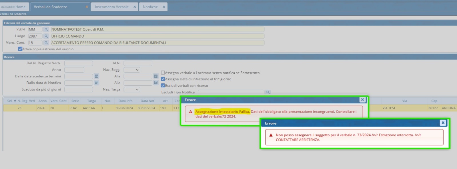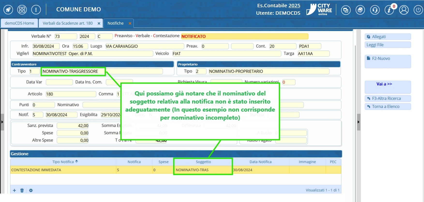 In questo caso ci compare una segnalazione dove ci informa di andare a controllare il verbale n. 73/2024 a causa di una incogruenza nel nominativo inserito all'interno della Notifica