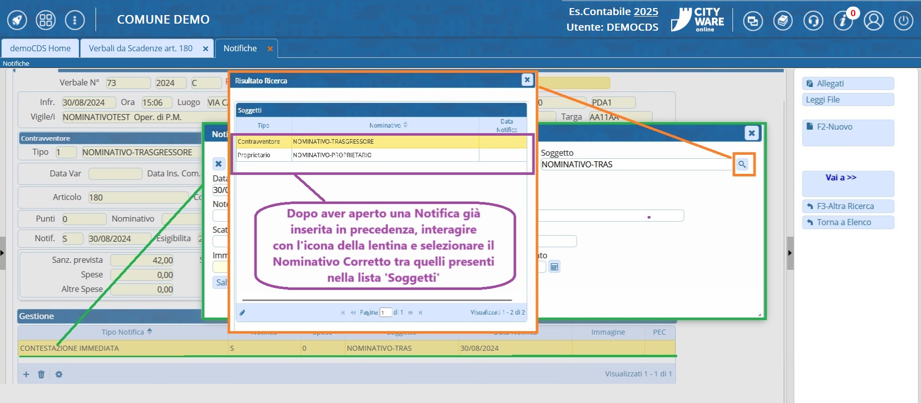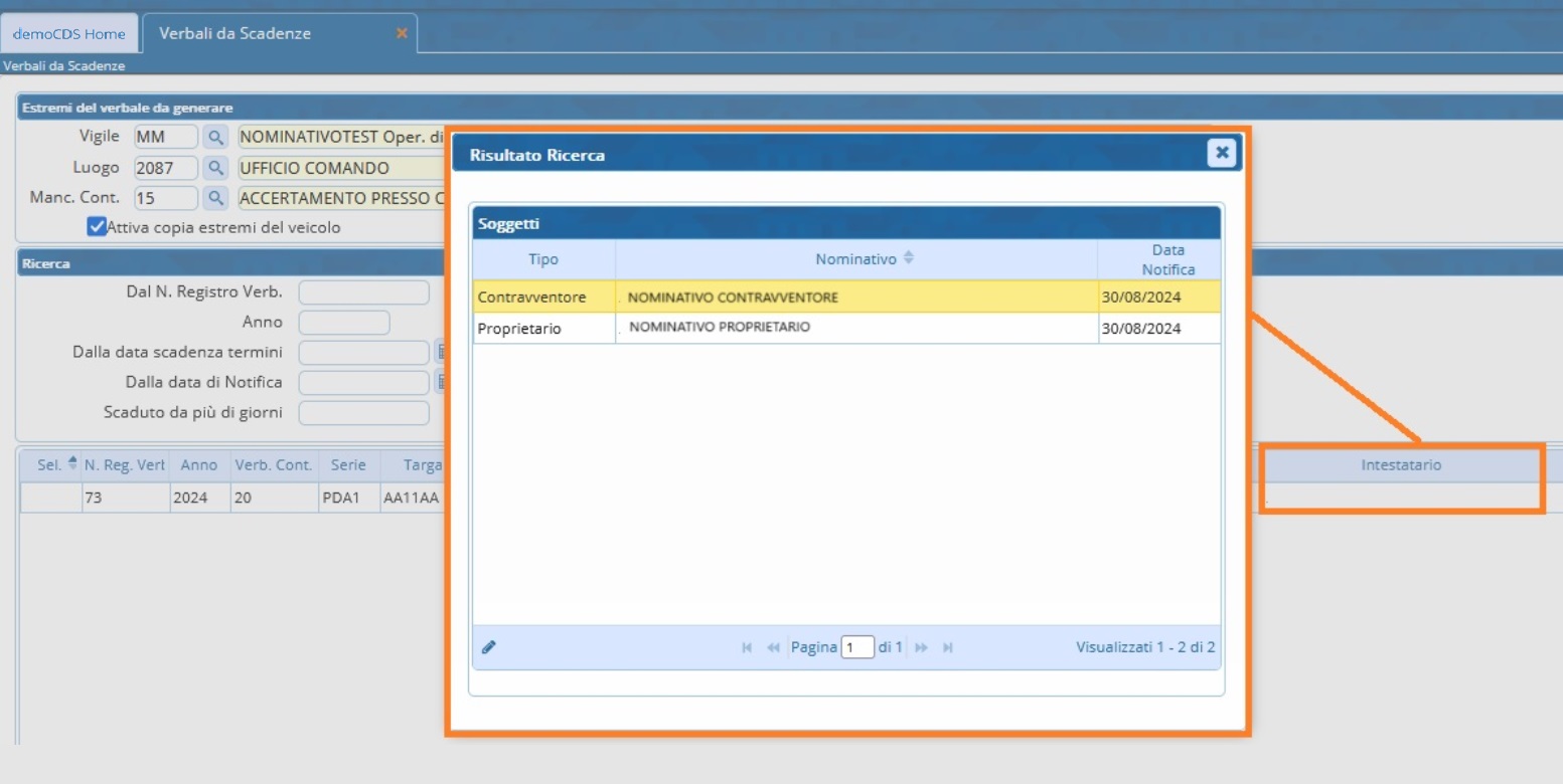 Per selezionare l'intestatario a cui si manderà questo nuovo verbale (o per cambiare l'intestatario!) che si genererà occorre cliccare due volte con il cursore sulla riga del numero verbale e selezionare il nominativo dalla schermata che comparirà a schermo subito dopo.