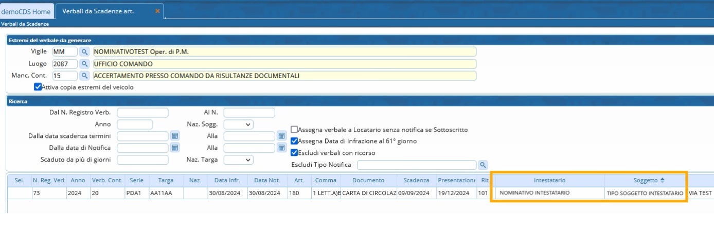 Tornando nel tab 'Verbali da Scadenze Art' se selezionando il nominativo del Soggetto-Intestatario e se tutti i dati sono stati inseriti come da procedura non dovrebbero più esserci segnalazioni. Qualora il programma segnalerà altri verbali con questo tipo di segnalazione, bisogna ripetere i controlli.