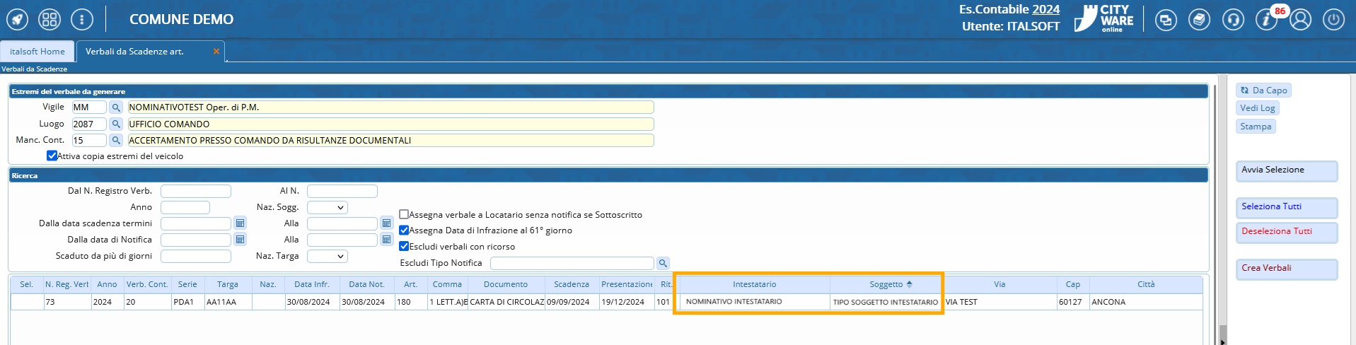 ▶ Verbali ▶ Verbali automatici da scadenze ▶ Articoli 180/Articoli 126bis