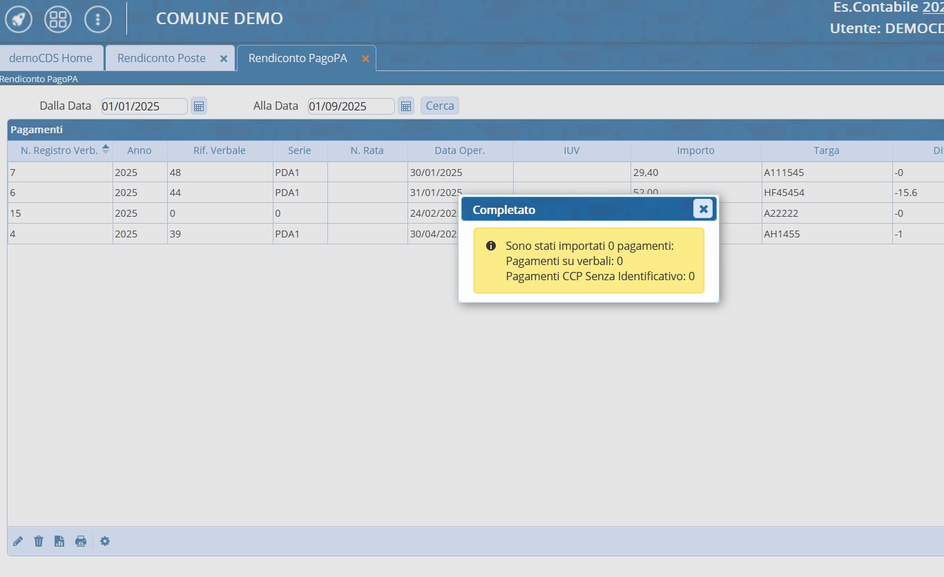 La lista che verrà importata ci fornirà un resoconto del totale dei Pagamenti su verbali e dei Pagamenti CCP Senza Identificativo.