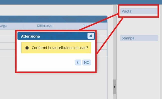 In alternativa potremmo vuotare la lista con il comando [Vuota]. per proseguire con la cancellazione dei dati confermare con SI oppure fare NO per annullare l'operazione.